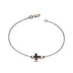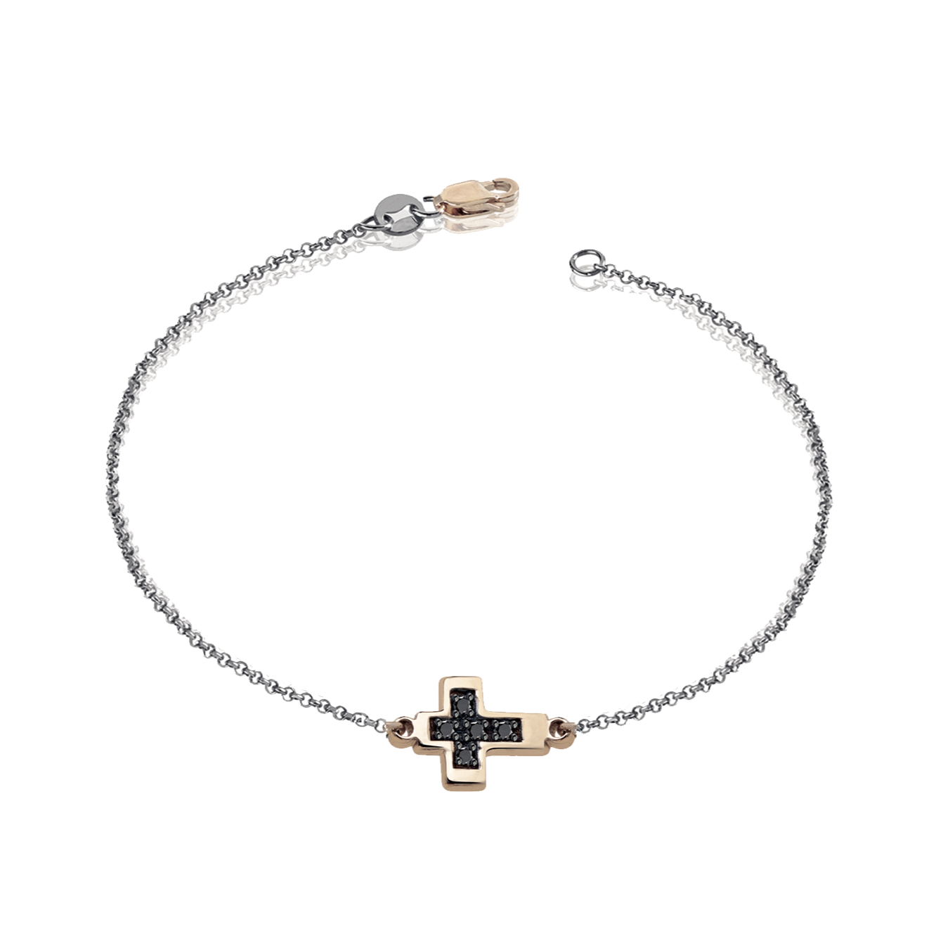 Lasciati conquistare dalla raffinatezza del nostro bracciale in oro bianco 9kt, impreziosito da una delicata croce in oro rosa. Il contrasto tra le tonalità luminose dell'oro e il misterioso scintillio degli zirconi neri crea un'armonia perfetta, simbolo di forza e fede. Questo gioiello non è solo un bracciale, ma una dichiarazione di stile e classe senza tempo, capace di illuminare i tuoi momenti e ispirare il tuo cammino.