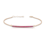 Bracciale in oro 18 kt con un elegante segmento di tennis, arricchito da rubini incastonati che donano un tocco di colore intenso e passione. La vivacità dei rubini, combinata con la lucentezza dell'oro, crea un effetto sofisticato e affascinante. Un gioiello perfetto per chi cerca un accessorio che unisce eleganza, brillantezza e un accento di calore e stile.