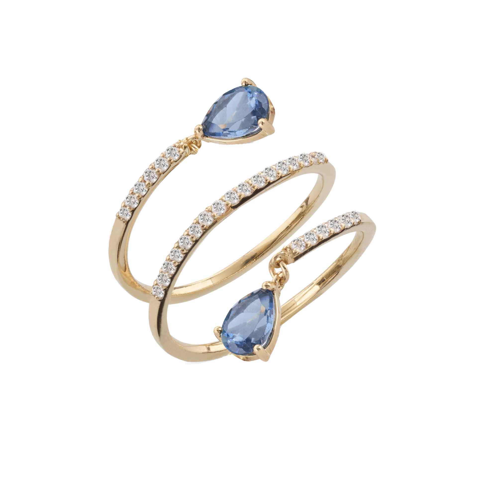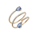 Anello in oro 18 kt a tre giri, arricchito da diamanti che avvolgono il dito con eleganza. All'estremità, due pendenti di topazi blu London, dal colore profondo e avvolgente, che aggiungono un tocco di luce e raffinatezza. Un design sofisticato e contemporaneo, perfetto per chi cerca un gioiello che combina brillantezza e carattere in un'opera senza tempo.