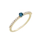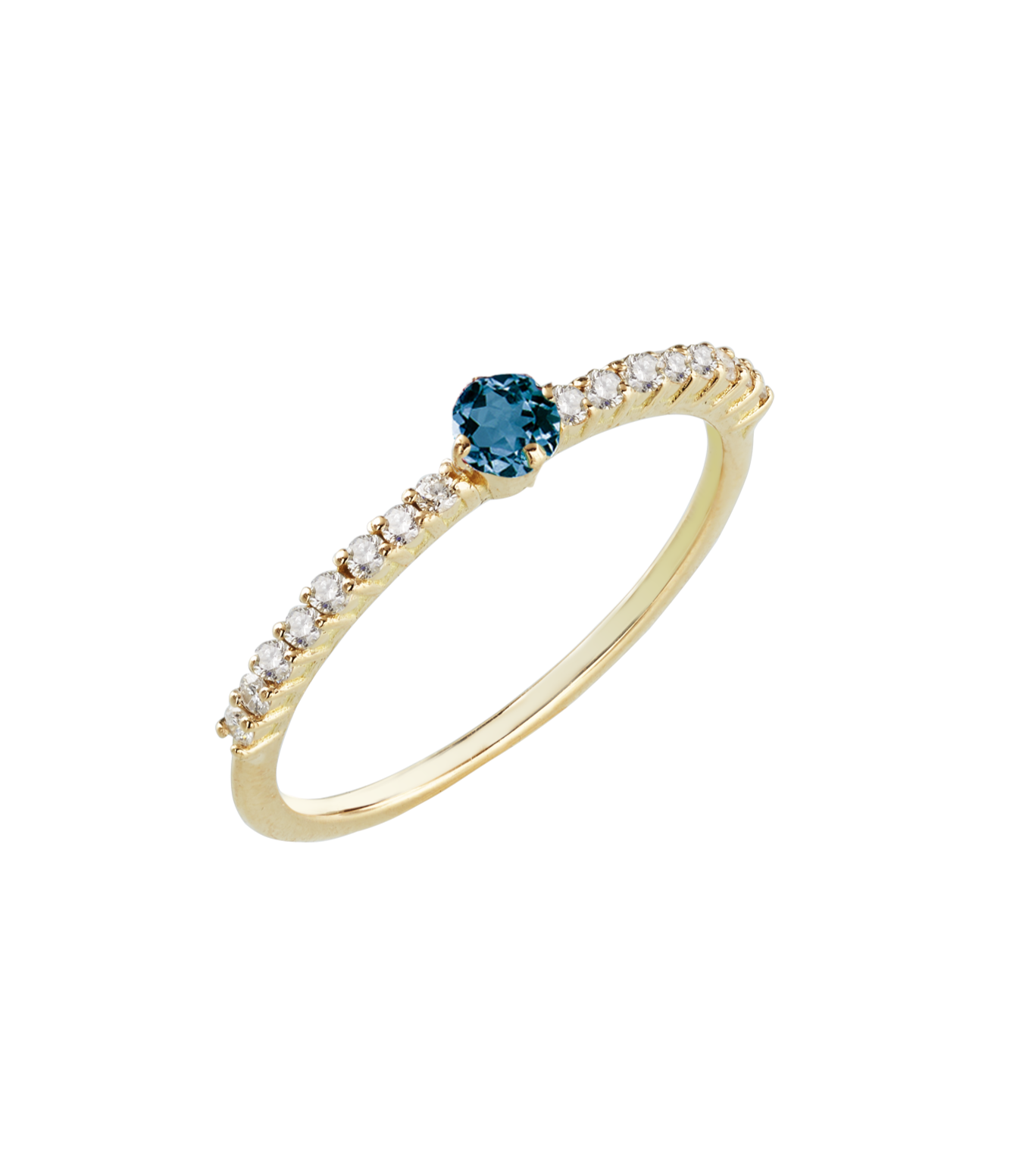 Anello in oro 18 kt dalla forma veretta, incastonato con diamanti che percorrono delicatamente tutta la circonferenza. Al centro, un topazio blu London, dal colore intenso e affascinante, che cattura la luce con ogni movimento. Un design sofisticato e senza tempo, perfetto per chi cerca un gioiello che unisce l'eleganza dei diamanti alla profondità del topazio, creando un contrasto straordinario di luci e colori.