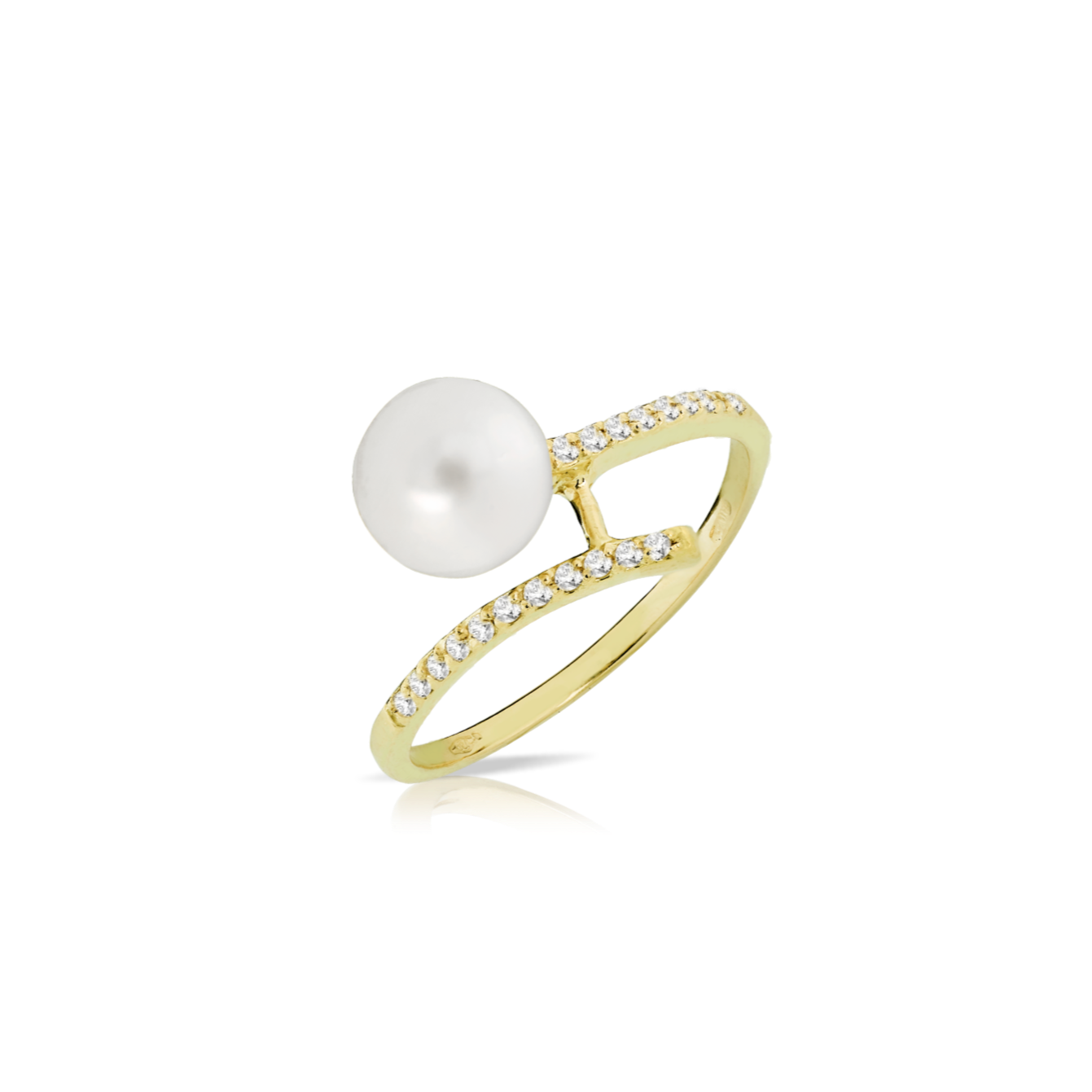 Anello asimmetrico in oro 18 kt, impreziosito da diamanti che seguono una linea elegante e fluida. All'estremità, una perla grande e luminosa aggiunge un tocco di raffinatezza senza tempo. Il contrasto tra la brillantezza dei diamanti e la morbidezza della perla conferisce un equilibrio sofisticato, perfetto per chi cerca un gioiello unico e contemporaneo. Un'interpretazione moderna dell'eleganza classica.