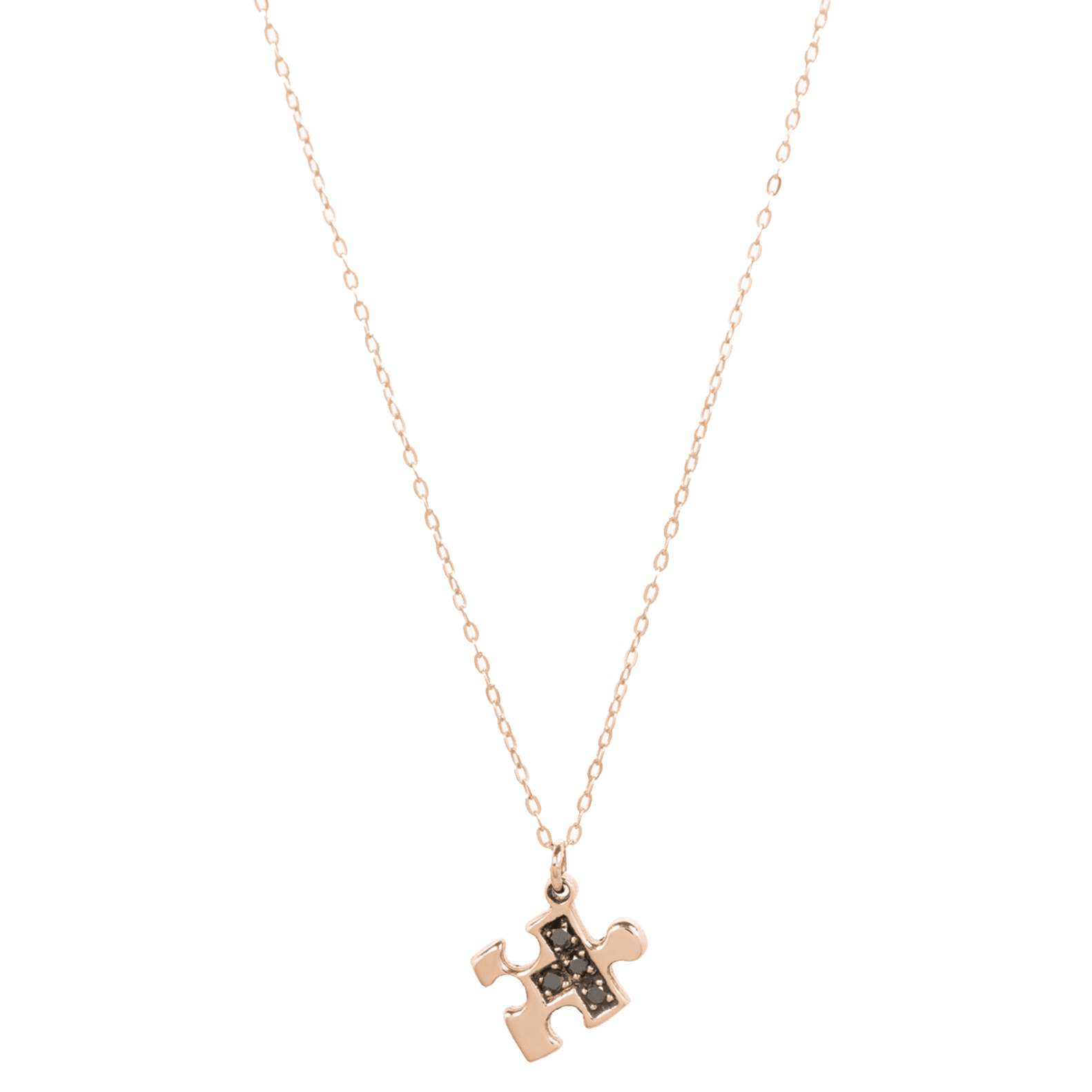 Un ciondolo a forma di puzzle in oro 18 kt, impreziosito da diamanti neri incastonati, simbolo di mistero e unicità. Questa collana è un tributo alla perfezione dei legami che si incastrano alla perfezione, unendo eleganza e audacia. Un gioiello raffinato, pensato per chi ama distinguersi con classe e fascino enigmatico