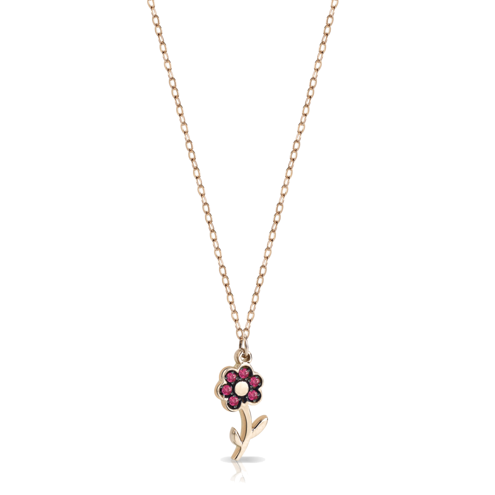 Delicatissimo ciondolo a forma di fiore in oro 18kt ed incastonato con rubini da 0,06 ct con una sottile catenina in oro. Perfetto da indossare anche con le altre collane della collezione Brillante by MyCharm. Il regalo ideale per celebrare un evento con i migliori auspici.