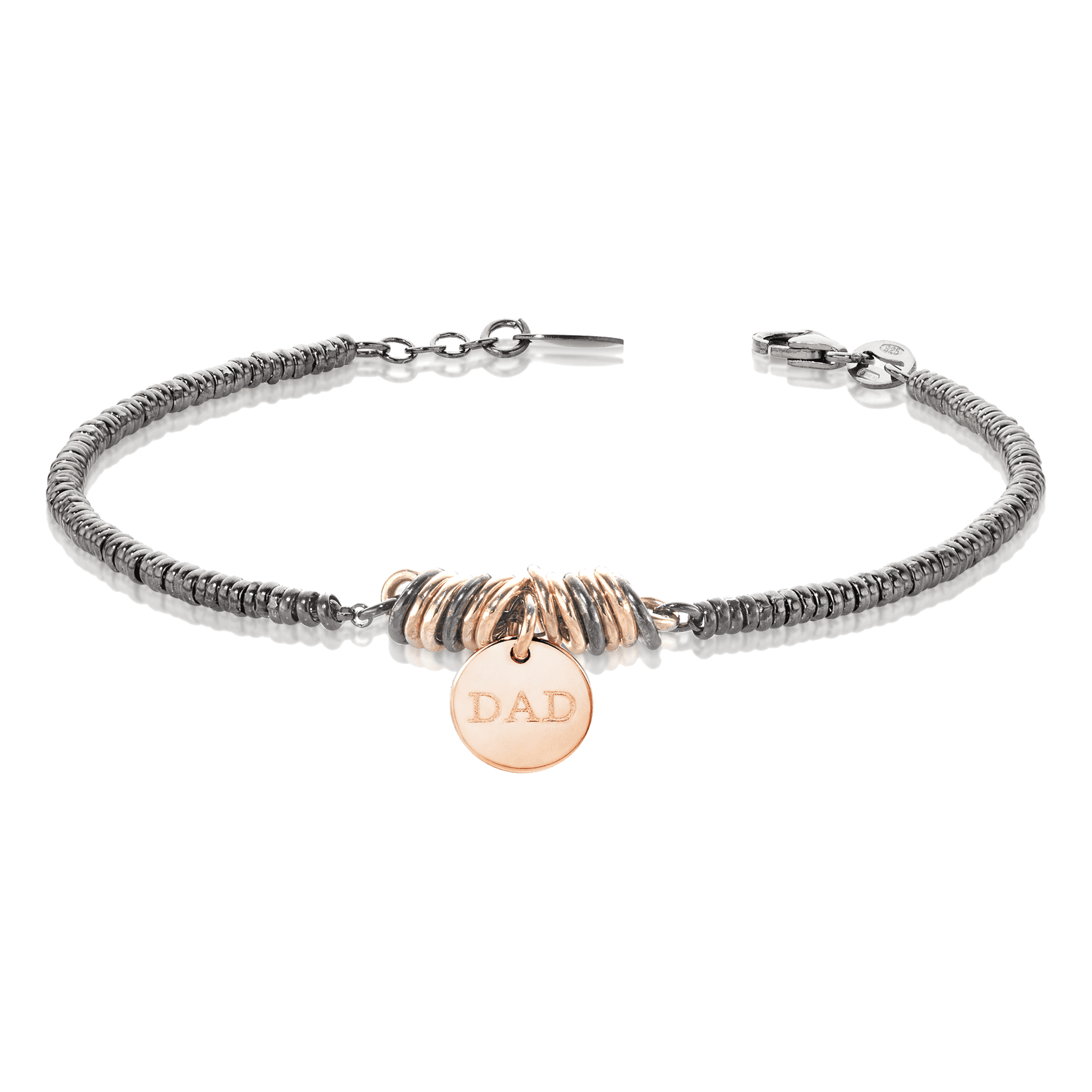 Bracciale in argento con una delicata medaglietta in oro 18 kt, su cui è incisa la parola "Dad". Il contrasto tra l'argento lucido e l'oro aggiunge eleganza e raffinatezza al design, mentre la medaglietta personalizzata rende il gioiello un omaggio speciale e significativo. Un bracciale semplice ma carico di affetto, perfetto per celebrare la figura paterna con stile.