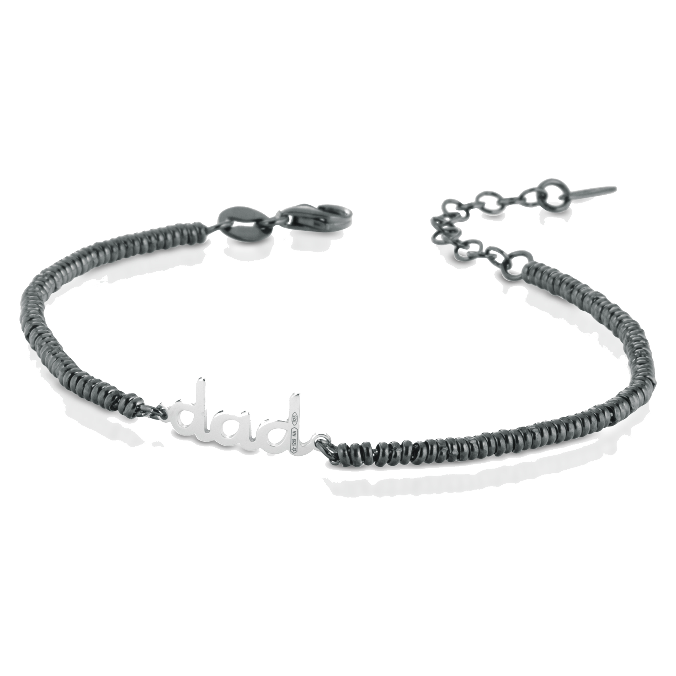 Bracciale in argento con la scritta "Dad" incisa in elegante corsivo, un dettaglio raffinato che rende omaggio alla figura paterna. Il design semplice e pulito, unito alla lucentezza dell'argento, crea un gioiello discreto ma significativo. Perfetto per chi cerca un regalo elegante e personale, che celebra l'amore e il legame familiare con stile.
