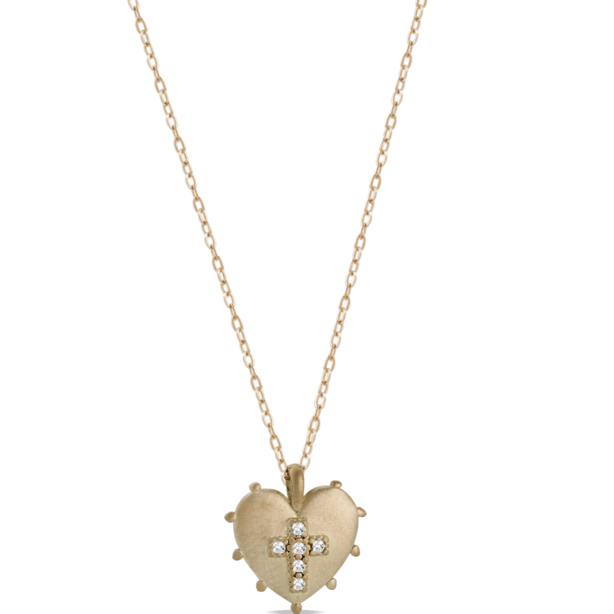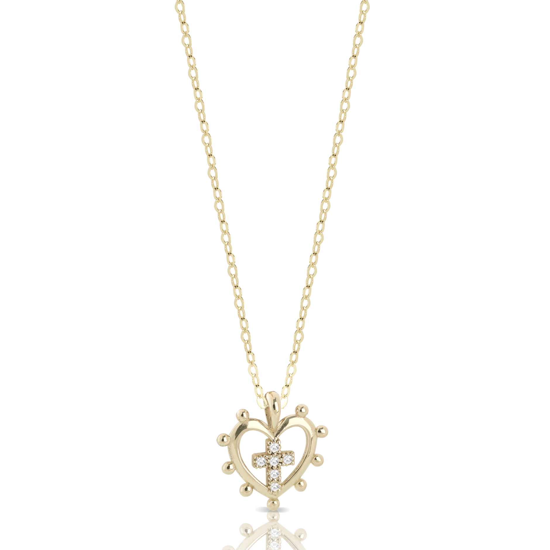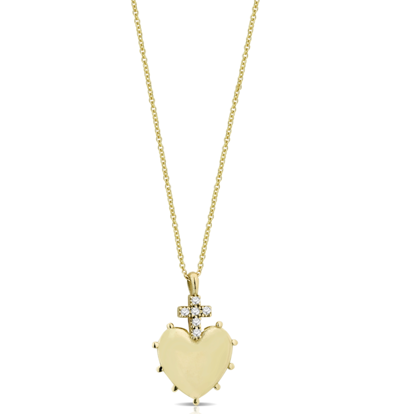 18kt Gold Necklace with Medium Sacred Heart and White Diamond Cross