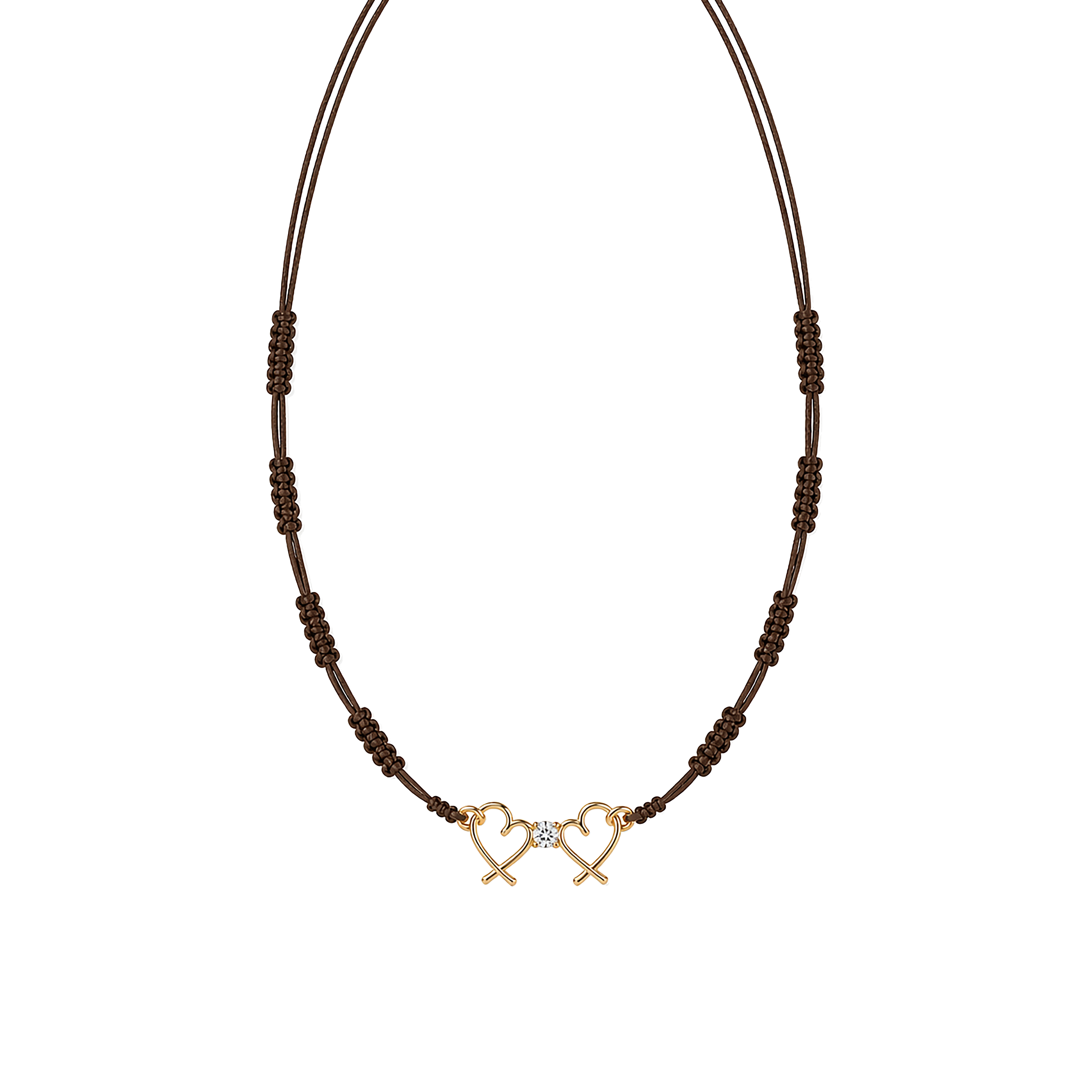 Collana cordoncino in oro 9kt con cuori e diamante lab grown ct. 0,05