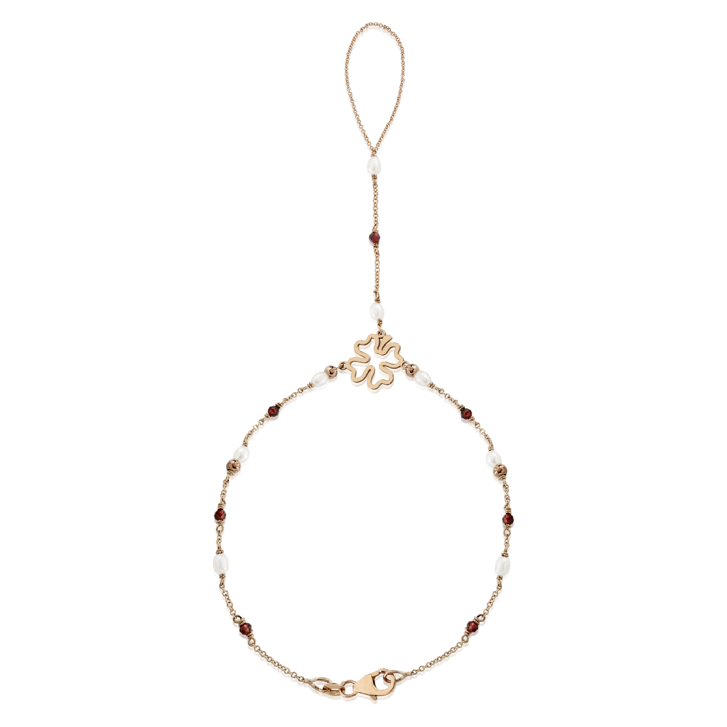 Fall in love with our 9kt gold Lucky Me Baciamano, a piece that captures the light and the heart. The delicate four-leaf clover charm symbolizes luck and love, while the garnet evokes passion and vitality. Every time you touch it, you feel a special connection to the beauty and magic of life, a reminder that luck is within your reach. This piece is not just an accessory, but a statement of your spirit and your story