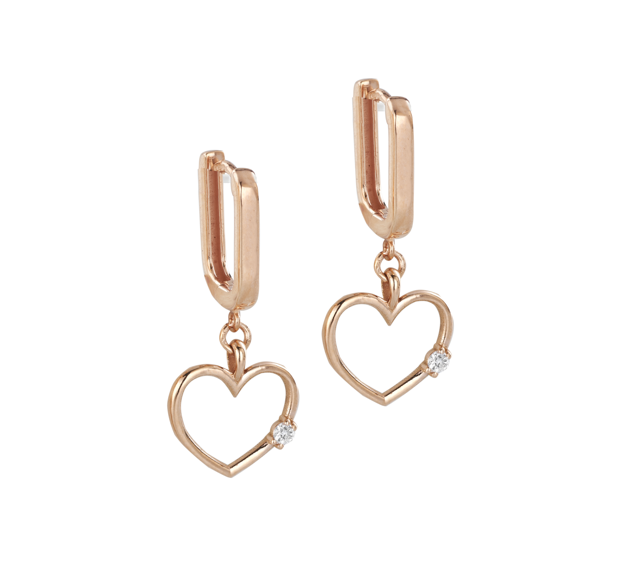 18kt gold rectangular earrings with hearts and white diamonds on the sides