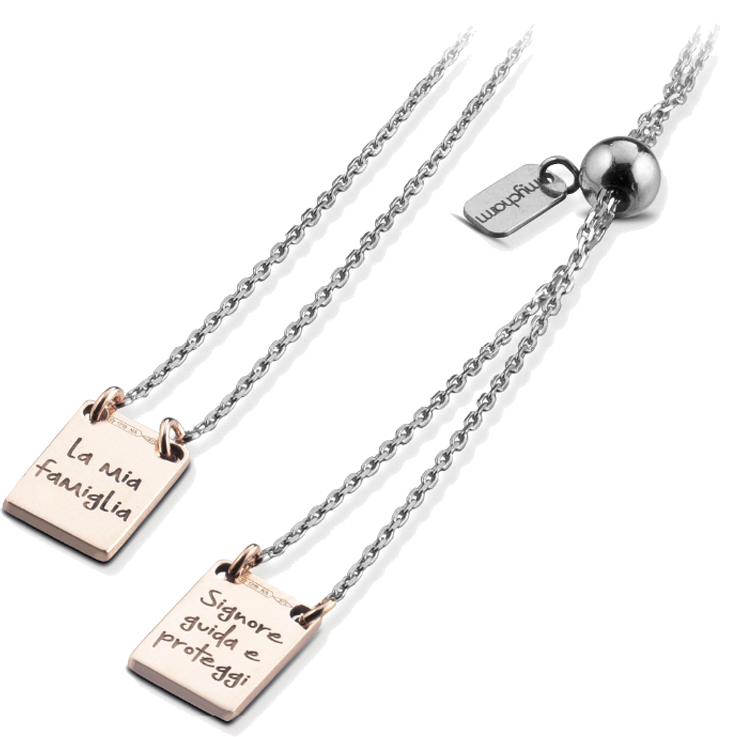 La collezione Baciacollo di MyCharm è nata ispirandosi alla già presente selezione di Baciamano. Con questo nuovo gioiello si intende proporre una collana impreziosita da due ciondoli, uno posizionato sul davanti e l’altro che si adagia sulle spalle. Inoltre il Baciacollo è dotato di una pallina slider in silicone per scegliere la lunghezza più adeguata. Un gioiello veramente elegante e versatile, una personalizzazione completa e un indosso perfetto per ogni occasione.